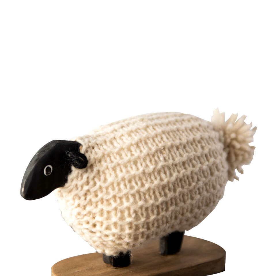 Outer Body: Sheep’s Wool Inner Body: Wood Legs: Recycled Iron Base: Wood Made: Hand-carved and hand-painted Dimensions: 14 x 15 cm.